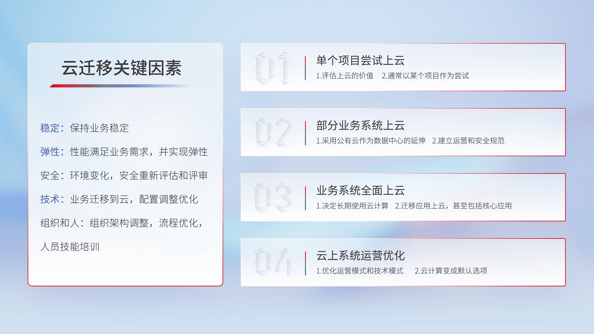 结合实际业务,,从规划设计、、云平台选型、、、、云原生改造、、数据迁移、、集成交付,,,,迁移全过程为客户识别最佳上云路径,,做好风险识别管理,,,设计网络架构、、、身份权限、、、、安全审计合规、、操作审计、、、、日志审计、、、监控告警策略、、、多站点容灾设计等,,,,对云上基础设施进行整体规划,,提升IT治理水平,,以满足弹性、、、、高可用、、高性能的需求。。。。